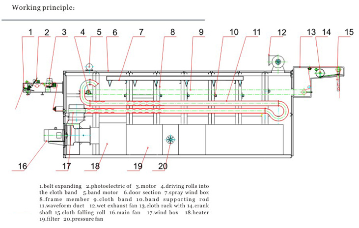 UME-310 Open width Loose type drying machine is a typical representative of domestic loose type dryer, the drying characteristic of this machine is: the fabric through the multi-layer mesh belt in the process of drying of holding and excellent air spray system undulate flabby condition, after processing of cotton, hemp, chemical fiber, silk feel fluffy and soft, towels and other woven fabrics and knitted fabric, warp and weft shrinkage obviously improved.